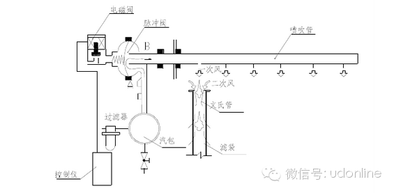 喷吹系统及其工作原理如图2所示。脉冲阀A端接压缩空气包,B端接喷吹管,脉冲阀背压室接埪制阀,控制仪控制着埪制阀和脉冲阀开启。当控制仪无信号输出时,控制阀的排气被关闭,脉冲阀喷吹口处与关闭状态,当控制仪发出信号时控制阀排气口被打开,脉冲阀背压室的气体泄掉,压力降低,膜片两面产生压差,膜片因压差作用而产生位移,脉冲阀喷吹打开,此时压缩空气从气包通过脉冲阀经喷吹管小孔喷至文氏管进入滤袋(从喷吹管喷出的气体为一次风)。当高速气体流通过文氏管过程诱导了数倍于一次风的周为空气(称为二次风),造成滤袋内瞬时正压,实现清灰。