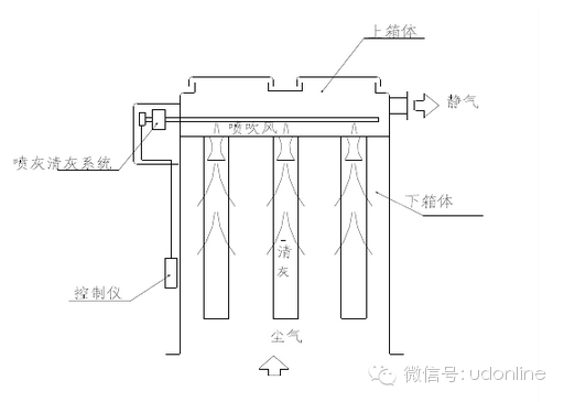 含尘气体由除尘器进风口进入中、下箱体,含尘气体通过滤袋进入上箱体过程中由于滤袋的各种效应作用将尘气分离开,粉尘被吸附在滤袋上,而气体穿过滤袋经文氏管进入上箱体,从出风口排出。含尘气体通过滤袋的净化过程、随着时间的增加而积附在滤袋上的粉尘越来越多,増加了滤袋的阻力,致使通过滤袋气体量逐渐减少。为使阻力控制在限定范围内(一般为120~150毫米水柱),保证所需气体量通过由控制仪发出指令,按顺序触发各控制阀开启脉冲阀,气包内的压缩空气瞬时地经脉冲阀至喷吹管的各孔喷出,在经文氏管喷射到各对应的滤袋内。滤袋在气流瞬间反向作用下急剧膨胀,使积附在滤袋表面的粉尘脱落,滤袋得到再生。被清除掉的灰尘落入灰斗,经排料阀排出机体。积附在滤袋上的粉尘被有周期地脉冲喷吹清除,使净化的气体正常通过,保证除尘系统运行。